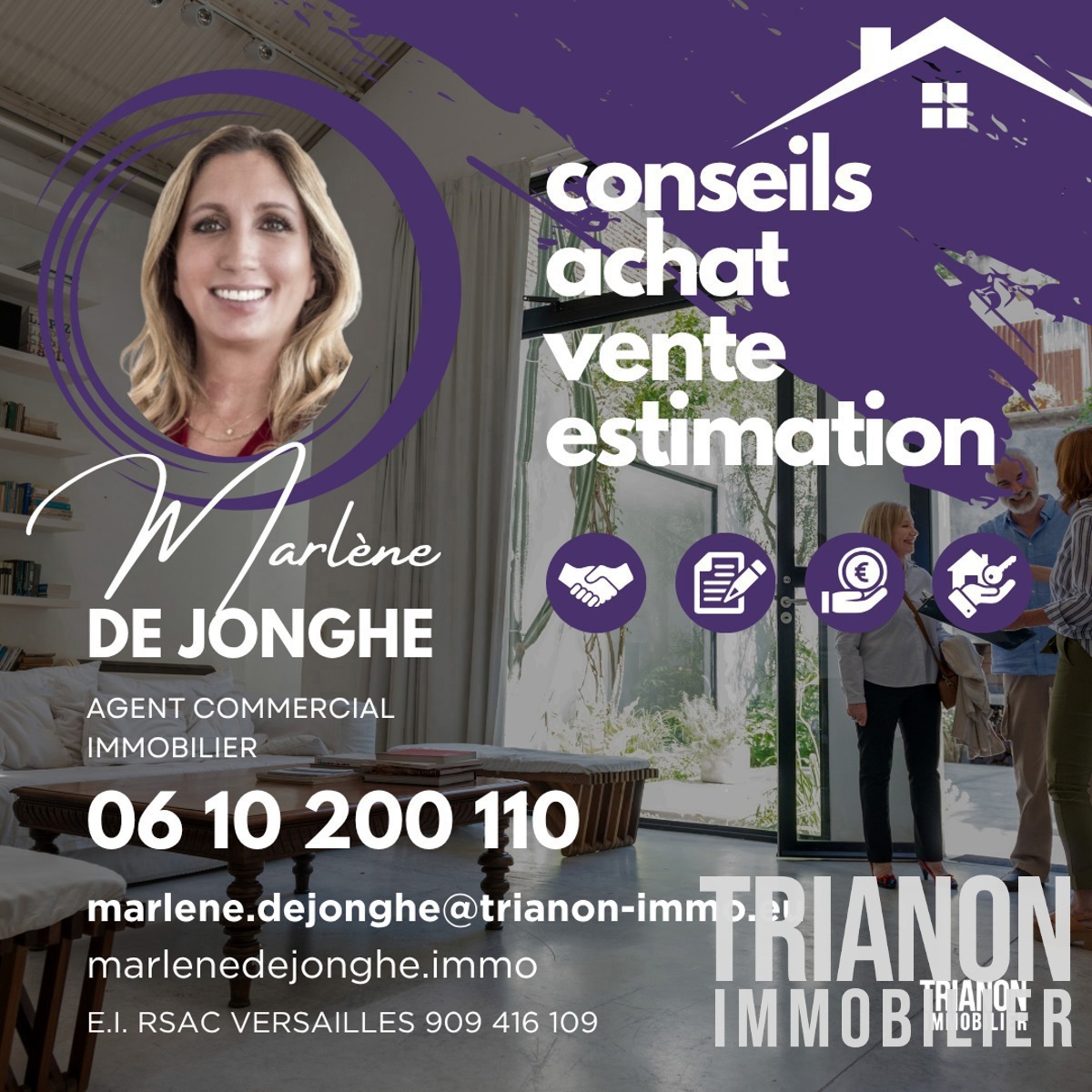 Contactez-moi dès maintenant pour organiser une visite, Marlène DE JONGHE, agent commercial immobilier EI, inscrite au RSAC Versailles 909 416 109.