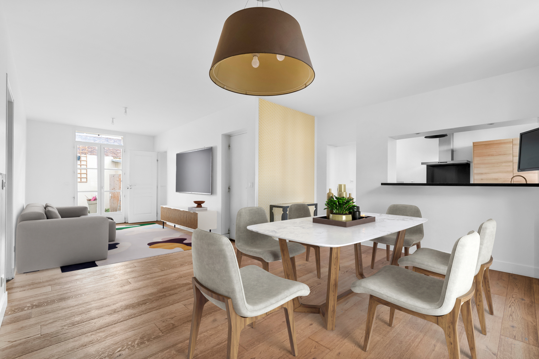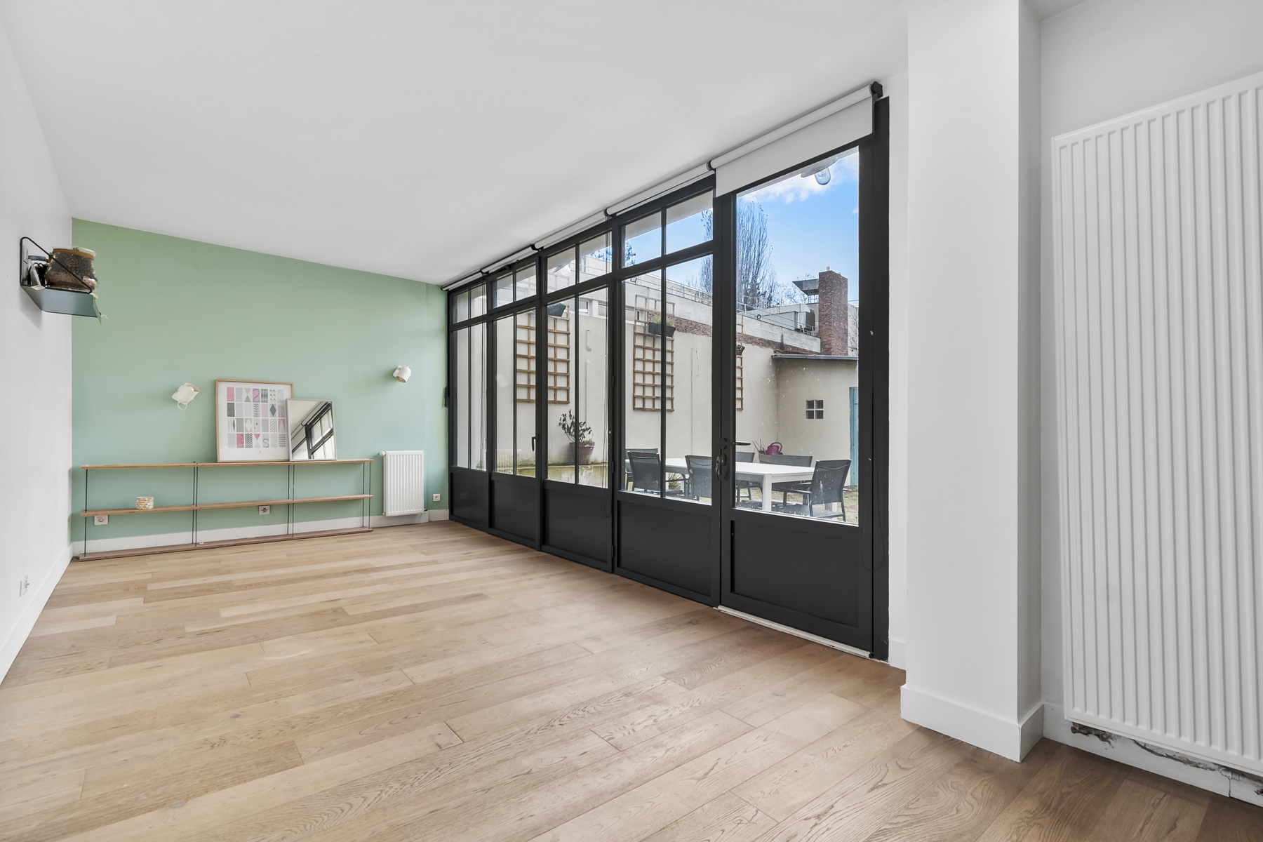 L’appartement s’ouvre sur un double séjour lumineux avec cuisine ouverte, puis une pièce de vie principale façon jardin d’hiver, baignée de lumière grâce à sa grande baie vitrée donnant directement sur un jardin privatif de 45 m², sans vis-à-vis.